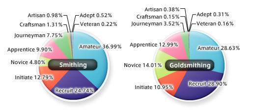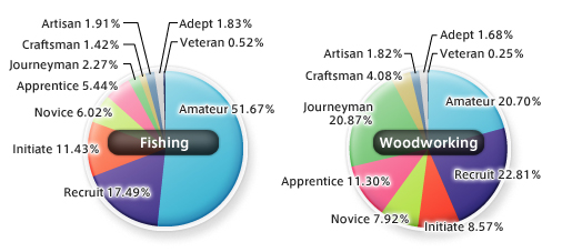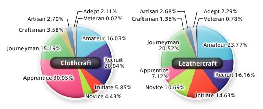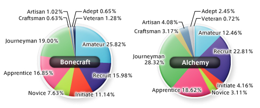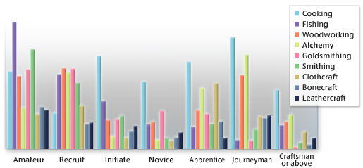 Looking at the bar graph we can see that cooking, alchemy, and woodworking are popular crafts, with many practitioners above the craftsman level. These are skills that create items immediately useful to adventurers such as juice, potions, and ninjutsu tools, and are relatively inexpensive to master due to the income generated through the sale of these items. Cooking in particular requires no other craft skills for most of its recipes and is the easiest for players to begin.