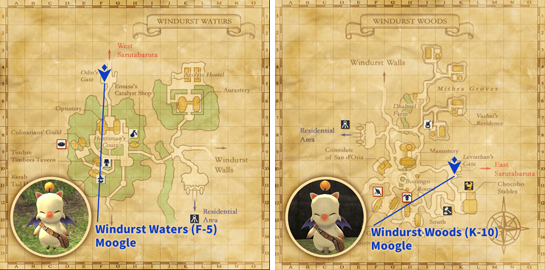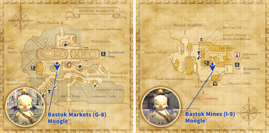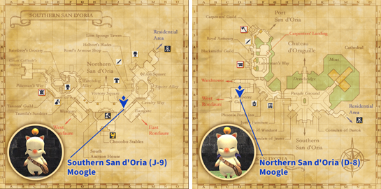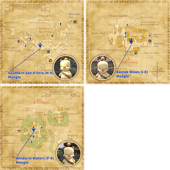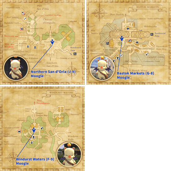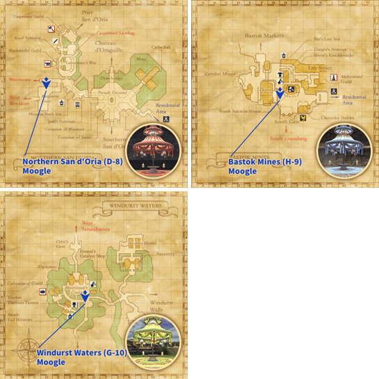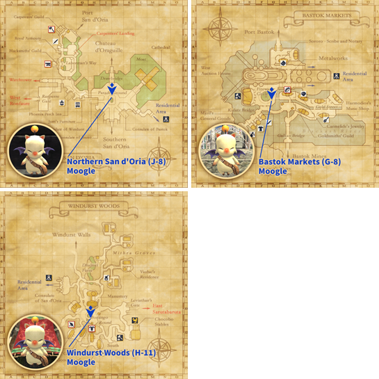 Present any gift tokens obtained during the Starlight Celebration to a festival moogle posted at one of the locations below, and you will receive seasonal items in exchange.