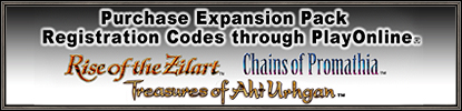 We are pleased to announce the sale of registration codes for all three Windows version expansion packs via PlayOnline! Players joining with the debut of the Starter Pack, Buddy Pass users and other new players will find it easier than ever to expand their adventures by purchasing registration codes directly from PlayOnline. Vana'diel Collection 2007 will continue to be available at retail stores for an economical way to enjoy all of the expansion packs.