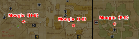 The moogles in the following locations will be selling Dream Hats and Snowman Caps, as well as other Starlight Celebration-themed items throughout the event.