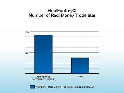Most of the investigation and actions focused on the most prominent RMT sites. As a result, the number of active sites has been reduced from 150 sites (estimated in November 2006) to roughly a third of their original number. We are continuing to enact counter-measures against smaller sites that were able to get past our original investigation.