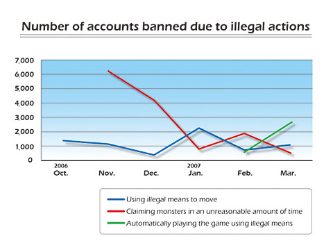 As of February 2007, the number of such characters has dwindled to roughly 1/6th of the original tally compared to November 2006. The number of accounts which we have had to take action against has decreased as a result of the counter measures being enacted by the Special Task Force. We believe that this is a definite sign that we are getting results.