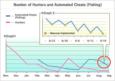 However, while the number of hunters has greatly decreased due to our large-scale efforts in dealing with them since the end of May, the number of characters engaged in the use of cheats to automatically repeat particular actions (specifically illegal fishing) has increased.