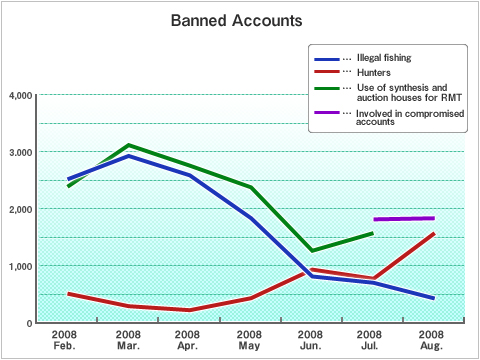 Because of this, since July, the Special Task Force has prioritized the banning of accounts involved in unauthorized access over all other issues. By focusing on dealing with accounts that have been accessed by unauthorized third parties, we believe we will be able to decrease the number of violators using auction houses for RMT.