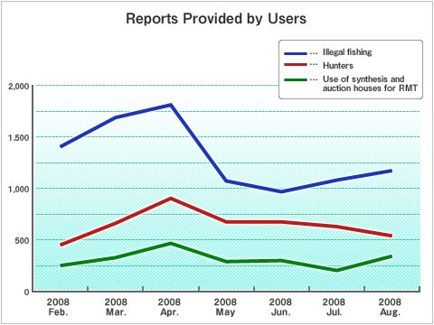 Next, we move to the issue of illegal fishing. Through our strengthened activities in May, we were able to successfully and significantly decrease the number of violators. Because the number of characters banned for illegal fishing is decreasing, we can also assume that the number of violators returning to continue these actions is decreasing as well. Also, according to the results of a Special Task Force investigation, there are virtually no accounts that were commandeered through unauthorized access being used for illegal fishing, and it seems that illegal fishing has calmed down.