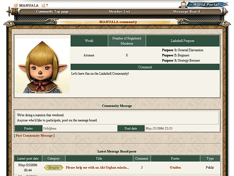 Many tools are provided by the Linkshell Community to support the groups that adventurers have formed within the world of FINAL FANTASY XI. For example, members of a linkshell will have access to an exclusive message board, as well as an up-to-date list of current member information. The Linkshell Community will also provide a linkshell search function and a list of recently formed linkshells for each individual World.