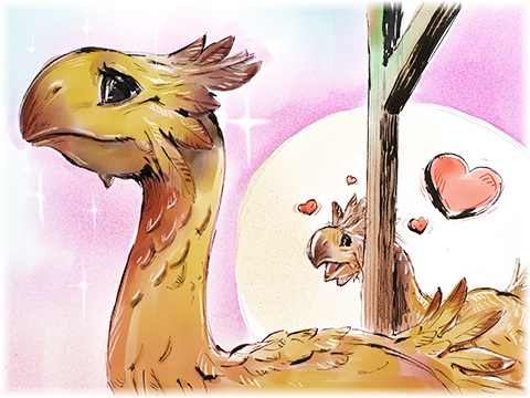 Still, Atelloune was quite clear; she wanted to see if chocobos really could fall in love. "Assist young, single chocobos in finding a mate. Make a detailed report on your findings." These were the research objectives laid out before Prycillia.